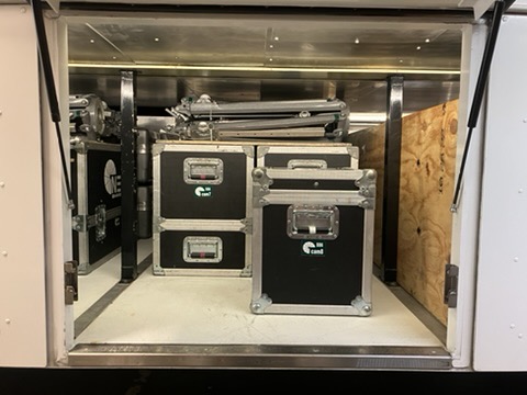 - Load 2 camera sled cases, handles out.